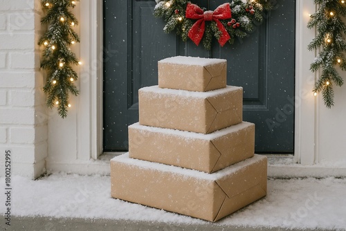 © Jafree, Obraz premium Snow-covered gift delivery boxes at doorstep during winter festive season in front of decorated doorway. concept of holiday delivery, winter decor, festive season