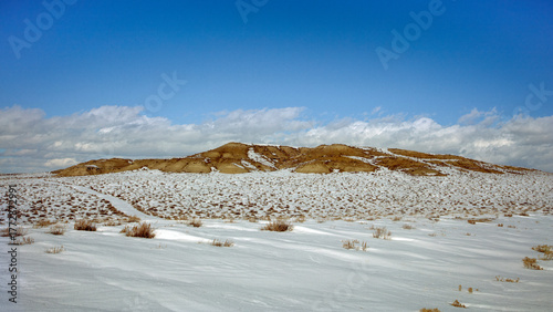 © jia, Obraz premium Snow-Covered High Desert Landscape with a Barren Mesa and a Winding Path