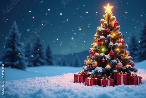 Obraz premium Snow-covered landscape, ornate Christmas tree, presents , rustic, snow, gifts