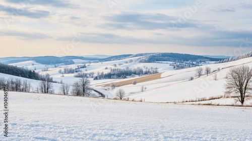 Fototapeta premium Snow-covered landscape under a pale gray winter sky with rolling hills and distant trees during a chilly day