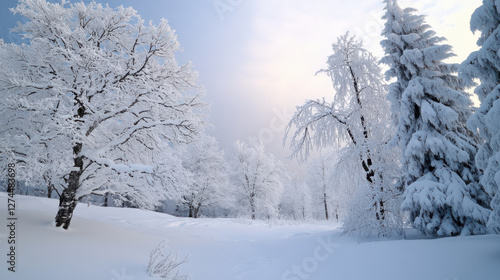 © vachiraphan, Obraz premium Snow covered landscape with frosty trees and serene atmosphere