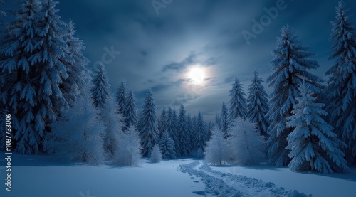 Naklejka premium Snow-covered landscape with tall pines and a glowing full moon on a serene...