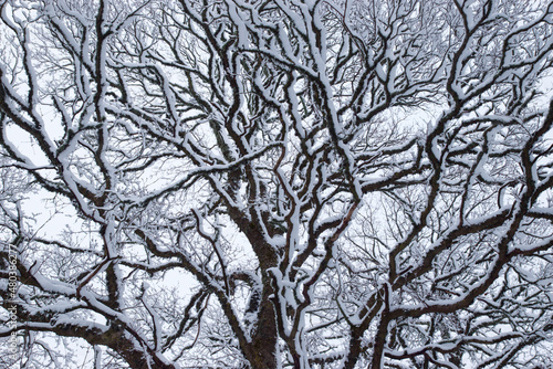 © uduhunt, Obraz premium Snow covered maple tree branches in winter, low angle view.