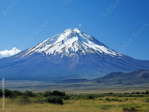 Fototapeta premium snow-covered mountain overlooking a grassy plain
