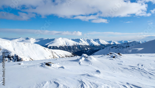 © kiu, Obraz premium Snow Covered Mountain Range Under a Bright Blue Sky