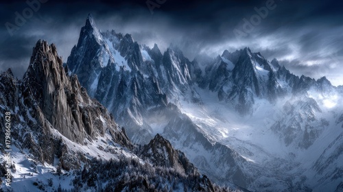 © matoya, Obraz premium Snow Covered Mountain Range Under Dramatic Cloudy Sky in Winter Scene