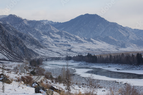 © Irina Solonina, Fototapeta premium Snow covered mountains and iced river