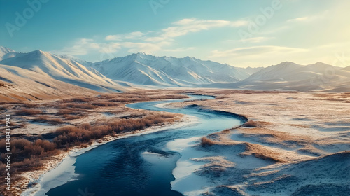 Obraz premium Snow Covered Mountains And Winding River Winter Landscape
