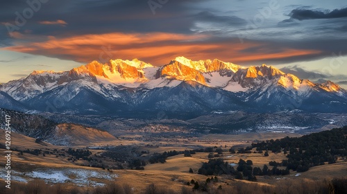 © saychandy, Obraz premium Snow-covered mountains at sunrise with golden light, ideal for nature and outdoor themes