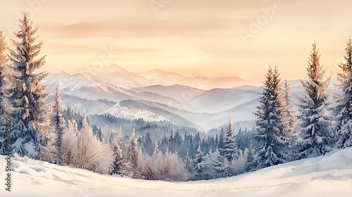 © Raitalinn, Fototapeta premium Snow-covered mountains bask in the soft glow of a winter sunrise.