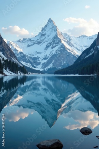 Fototapeta premium Snow-covered mountains reflected in a calm lake, reflection, serene
