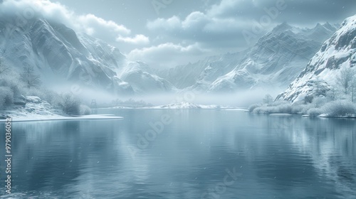 © racesy, Fototapeta premium Snow-Covered Mountains Reflecting in a Still Lake