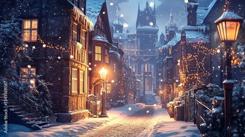 Obraz premium Snow-covered old town street, colorful facades glowing under lamppost light,...