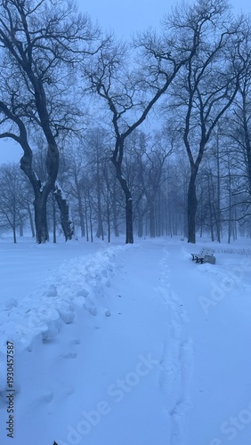 © AndreyZayats, Fototapeta premium Snow-covered park bench beside a frosty winter footpath at twilight, surrounded by tall bare trees and thick blue mist