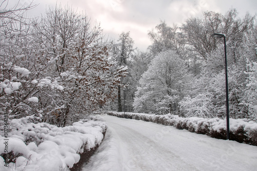 Fototapeta premium Snow-covered Park, forest, large snowdrifts. Snowstorm, snowstorm, winter. Huge drifts lie on the road. During the day, fluffy white snow falls in the Park.