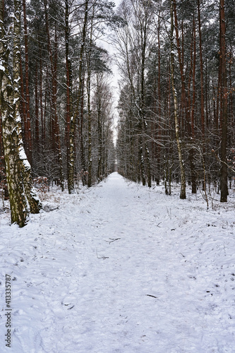 Fototapeta premium Snow-covered path in a deciduous forest during winter