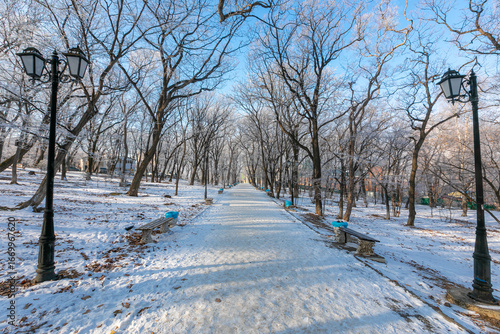 Naklejka premium Snow-covered path in a winter park.