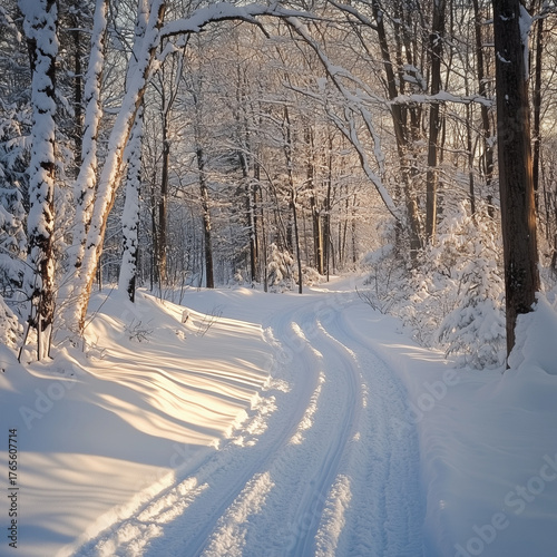 © AIRina, Obraz premium Snow-covered path winding through a tranquil winter forest