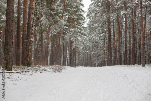 Fototapeta premium Snow-Covered Pathway Through a Pine Forest