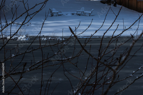 © Taya, Fototapeta premium snow covered patio set near a lake