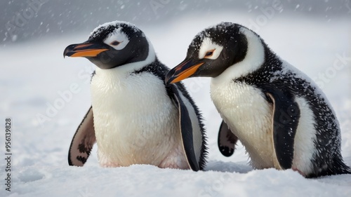 © Saad, Fototapeta premium Snow-covered penguin babies snuggling together