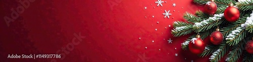Naklejka premium Snow-covered pine branch with ornaments and snowflakes on deep red background, white, , Christmas tree