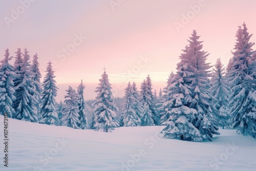 © Chotijah, Naklejka premium Snow-Covered Pine Forest at Sunset