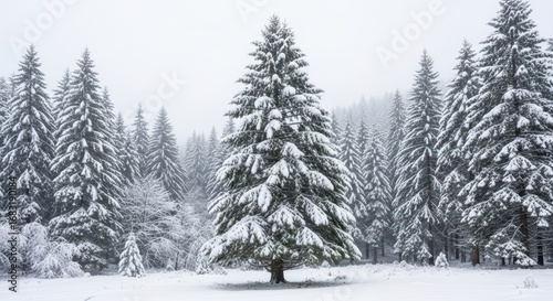 Fototapeta premium Snow-covered pine forest in winter wonderland landscape