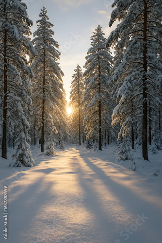 © Floki, Naklejka premium Snow-Covered Pine Forest – Winter Serenity