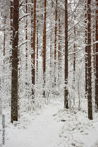 Fototapeta premium snow covered pine forest with path