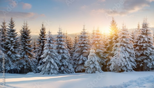 Fototapeta premium Snow-covered pine trees glowing under the winter sun, peaceful and serene winter