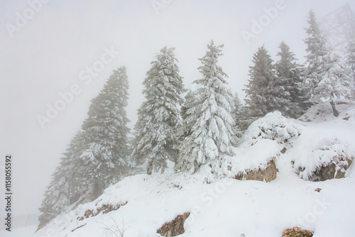 Naklejka premium Snow-covered pine trees in a misty winter landscape