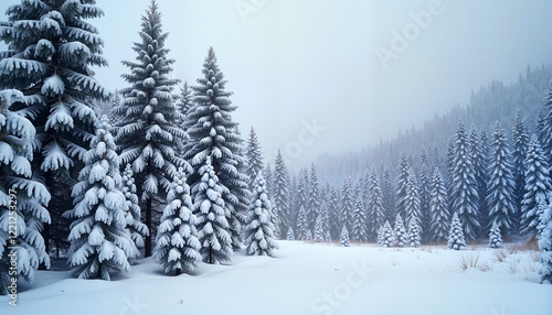 Naklejka premium Snow-Covered Pine Trees in a Peaceful Winter Landscape