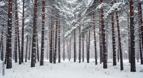 © Ashan, Obraz premium Snow covered pine trees in a winter forest landscape with a white ground and a cold atmosphere