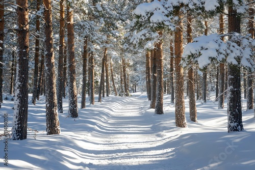© Ghulam, Obraz premium Snow-covered pine trees on a quiet forest trail, sunlight casting long shadows
