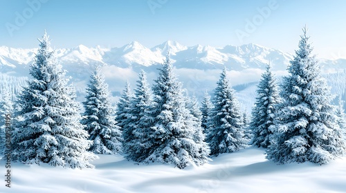 Fototapeta premium Snow covered pine trees stand before snow capped mountain ranges