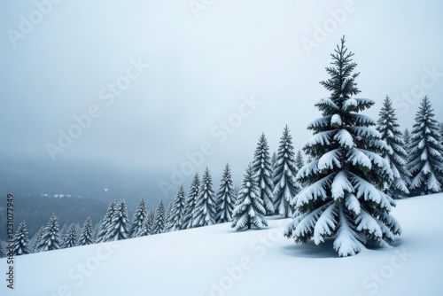 Fototapeta premium Snow covered pine trees stretched up towards grey sky, serene, winter landscape