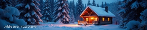 Fototapeta premium Snow-covered pine trees, twinkling lights, cozy cabin , greeting, magical, background