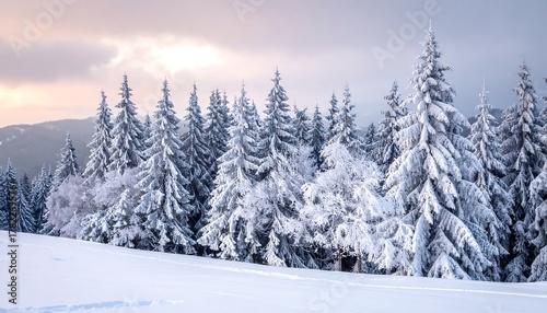 © Miyako, Fototapeta premium Snow-covered pine trees under a cloudy sky, creating a serene winter landscape