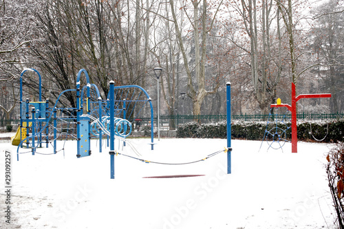 © Andrea, Fototapeta premium snow covered public children playground at winter time