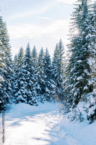Fototapeta premium Snow-covered road in a coniferous winter forest in the sun rays