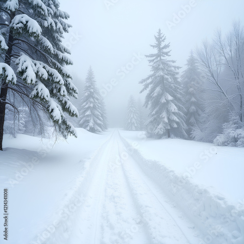 © Aitfatoul, Naklejka premium snow covered road in the forest