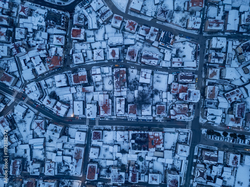 © sandsun, Obraz premium Snow-covered rooftops create a stunning winter landscape in a quaint Bansko town at twilight