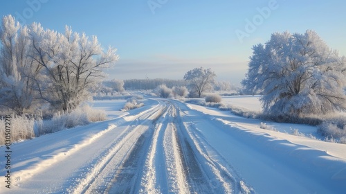 Fototapeta premium Snow covered rural road with wooded area in the distance