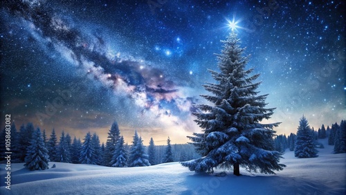 Naklejka premium Snow covered spruce tree in winter forest under starry night sky silhouette