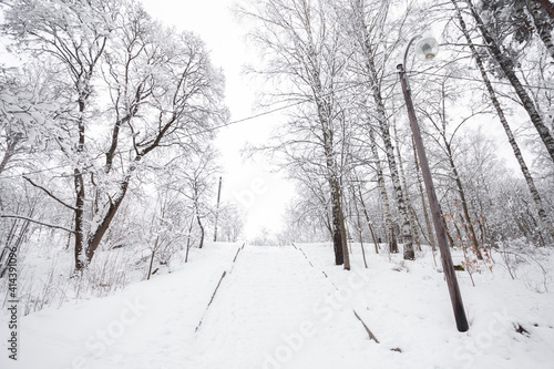 Fototapeta premium Snow-covered stairs in the park. winter landscape . Guiding lines.