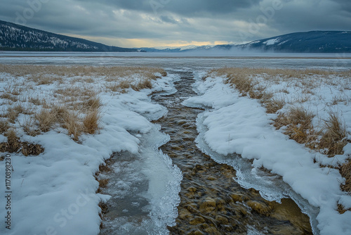 Obraz premium Snow-covered stream flows through a winter landscape in a remote mountainous...