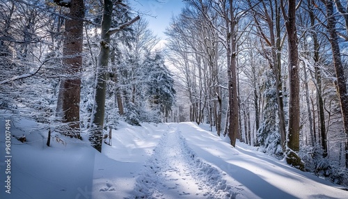 Obraz premium Snow-covered trail through woods