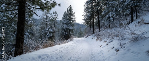 Naklejka premium Snow-covered trail twisting through a wooded area for off-road vehicles...