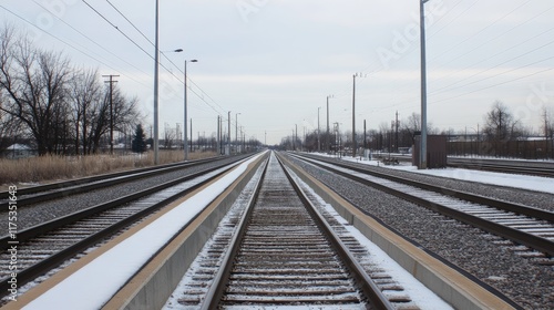 Fototapeta premium Snow-covered train tracks receding to the horizon on a cold, overcast day.